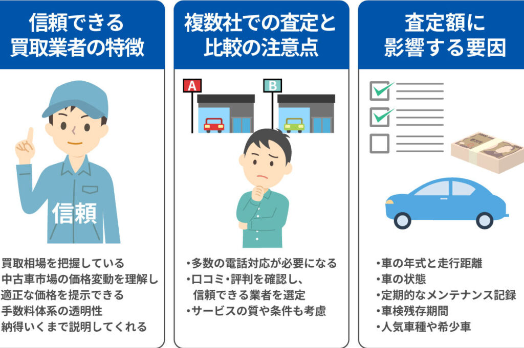 - 査定手法:業者による査定基準が異なるため、複数の査定を受ける。
