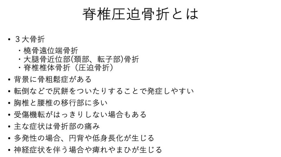 腰椎圧迫骨折は、主に脊椎の腰の部分が圧縮されて骨折する疾患です。この状態は、特に高齢者に多く見られ、骨密度の低下や外的な衝撃が原因となることが一般的です。また、骨粗しょう症の人々が特にリスクを抱えています。