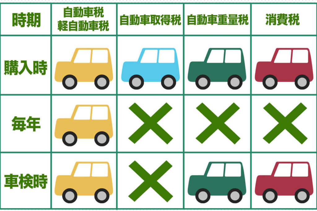 - 自動車税: 毎年課税され、車両の排気量によって異なる。