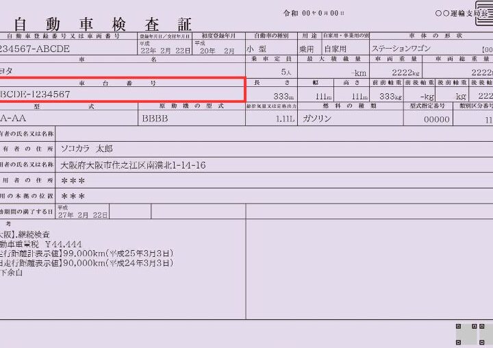 車両登録証にも車台番号が記載されています。この証明書を使えば、簡単に確認できます。以下の点に留意してください。