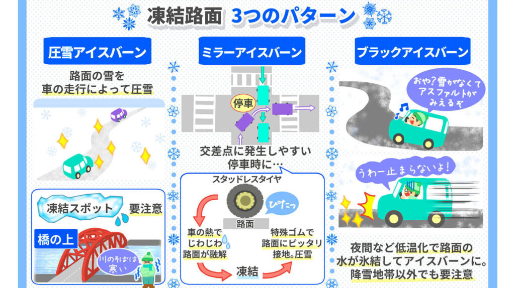 - ブレーキスリップ: 急ブレーキ時にタイヤがロックし、滑りやすくなる。