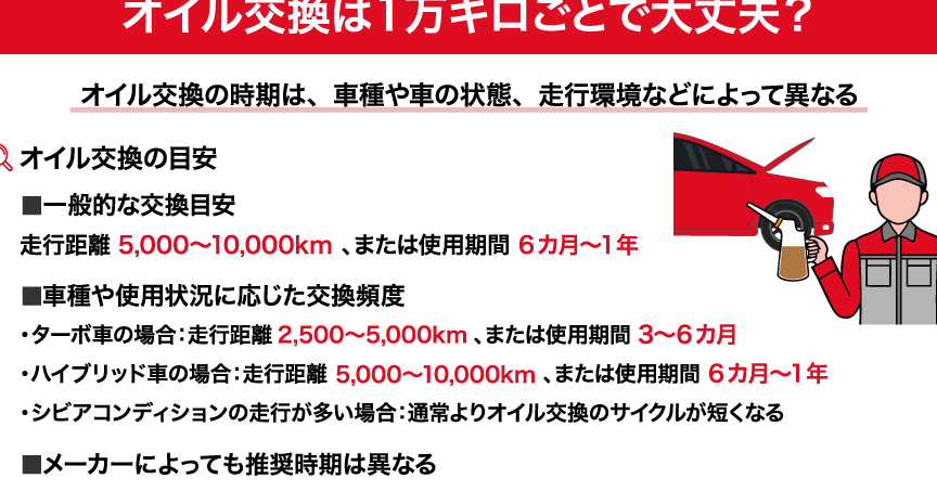 - 3ヶ月: 短距離走行のみの車両は、オイルの劣化が早いため、3ヶ月ごとの交換が推奨されます。