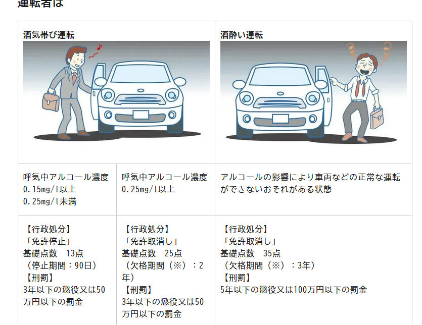 - 酒気帯び運転: アルコールの影響下で運転すると、厳しい罰則があります。