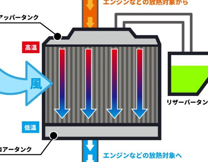 - 熱交換:ラジエーターは冷却液と空気の熱を交換し、エンジン内の温度を下げます。
