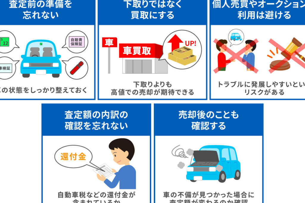 査定を受ける際、複数の業者から見積もりを取ると良いです。他社との比較ができ、より良い価格を得やすくなります。また、査定前に車内を清掃し、必要な修理を行うことで、査定額がアップすることもあります。