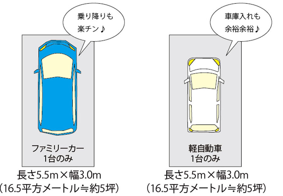 - 普通自動車: 約2.5坪(長さ約5メートル x 幅約2.5メートル)