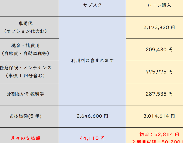 - 初期投資: 中古車を購入する際には頭金や登録費用がかかりますが、車サブスクでは初期投資が少なくて済む場合があります。