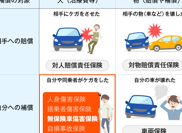 - 法的義務への対処:相手方が無保険である場合でも、自分自身と同乗者を守るために必要な保障があります。