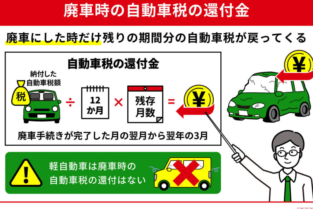 還付金額は、自動車税や軽自動車税などの未経過分をもとに計算されます。以下に一般的な計算式を示します。