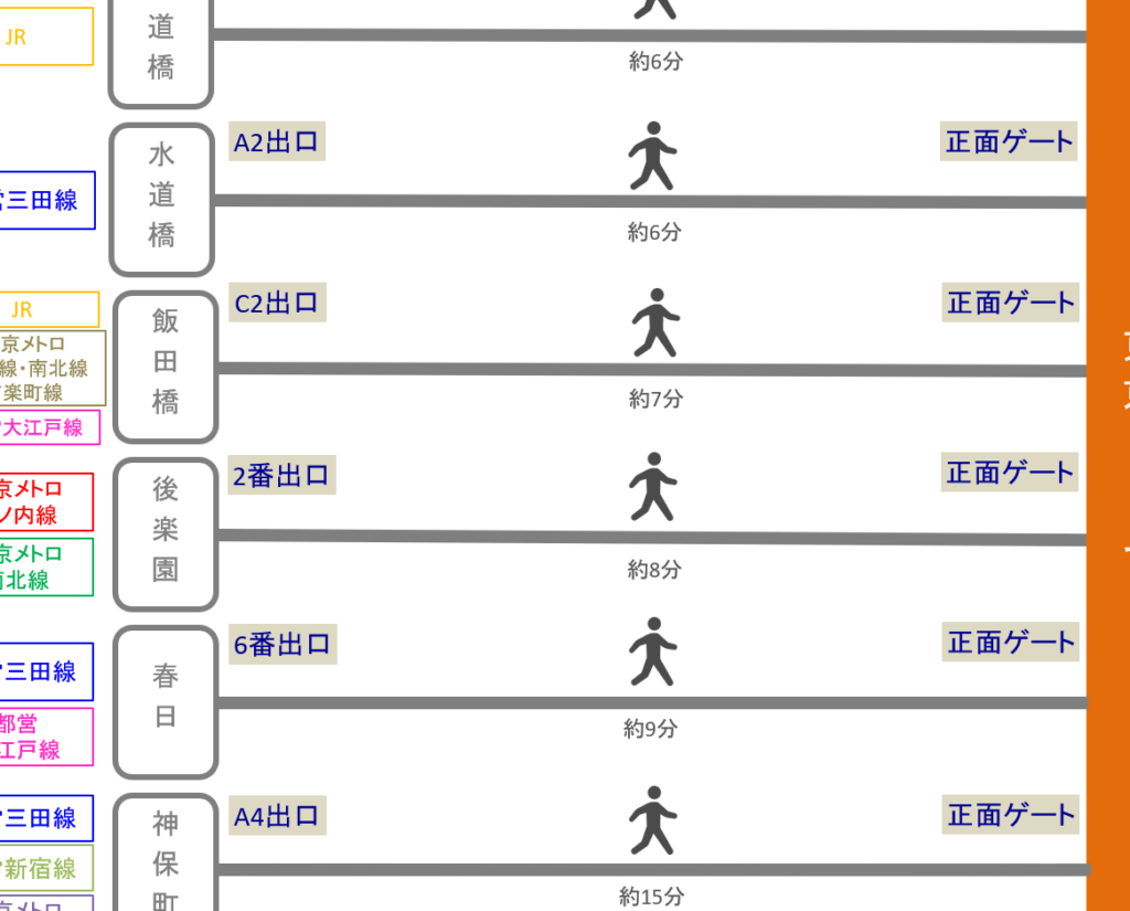 それぞれの最寄り駅から東京ドームまでの具体的なルートをご紹介します。特に混雑が予想される時間帯には、事前に確認しておくと安心です。