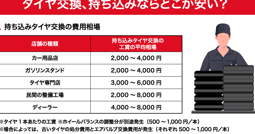 以下は、日本国内で人気のあるタイヤ交換業者の価格一覧です。これらの情報を基に、どこが最もお得か判断する手助けになるでしょう。