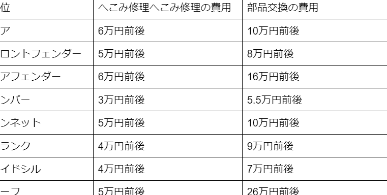 まずは、代表的な修理内容別の平均的な費用について見てみましょう。以下の表は、一般的な修理作業に対する相場感を示しています。