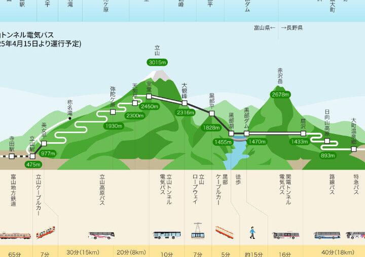 立山黒部アルペンルートでは、以下の交通手段が利用可能です。