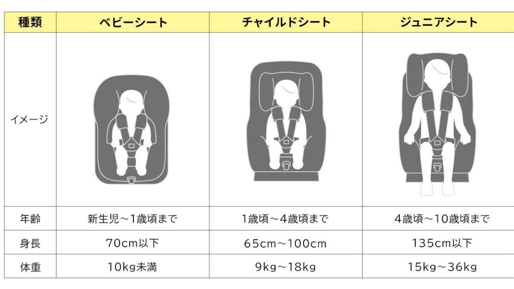 | 前向きチャイルドシート | 4〜10歳未満 | 体重15kg以上推奨、大人と同じようなサポート。 |