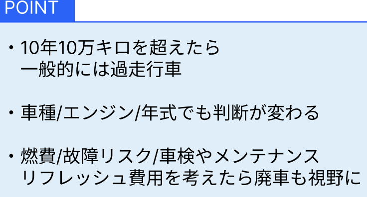 - 10万キロメートル:エンジンオイルや冷却液など、多くの消耗品の交換時期。また、部品によっては故障リスクが高まります。