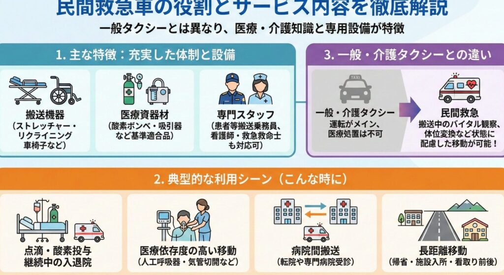 | 緊急処置能力 | あり(即時対応可能) | なし(輸送のみ) |