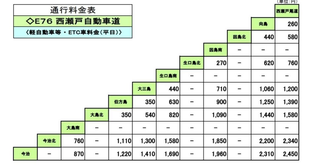 このように、しまなみ海道の各区間はそれぞれ異なる料金設定がありますので、自分たちのルートに基づいて合計金額を計算する際には注意が必要です。また、この情報を元に旅行プランを立てるときにも役立つでしょう。
