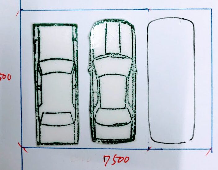 縦列駐車は、一台ずつ前後に並べるスタイルです。この場合、各車両間の隙間を考慮しながら設計することが重要です。一般的には次のようなスペースが必要となります: