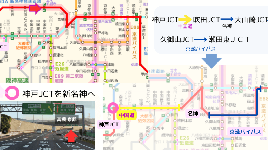 - 中央自動車道 → 名神高速道路 → 中国自動車道 → 山陽自動車道